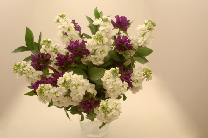 Violierenboeket in harmonisatie met diverse blad- en bijmaterialen.