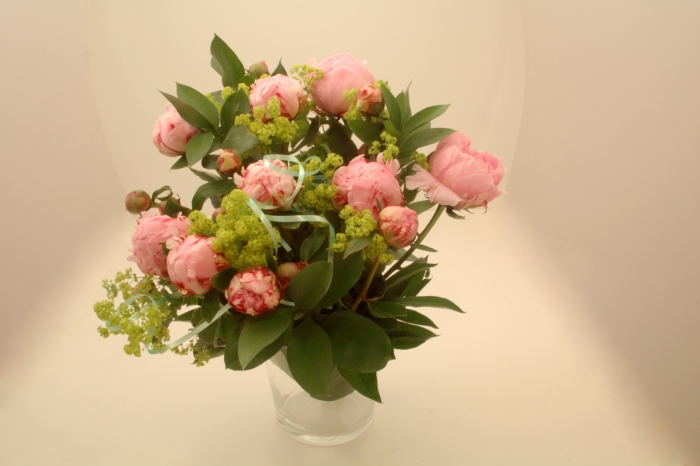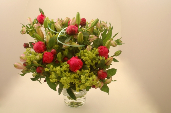 Hollands pioenrozenboeket in combinatie met vrouwenmantel, lelie, blad- en bijmaterialen.